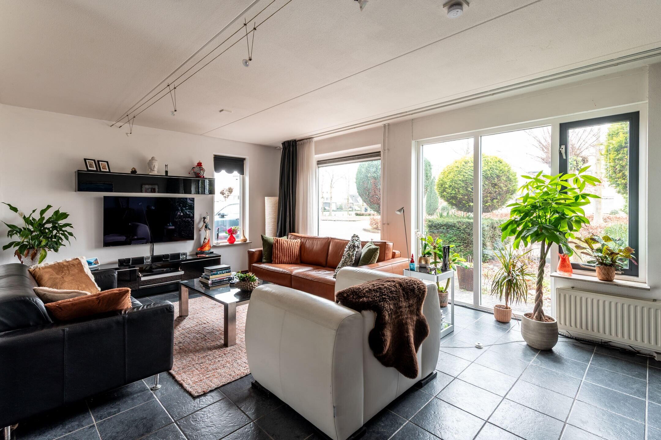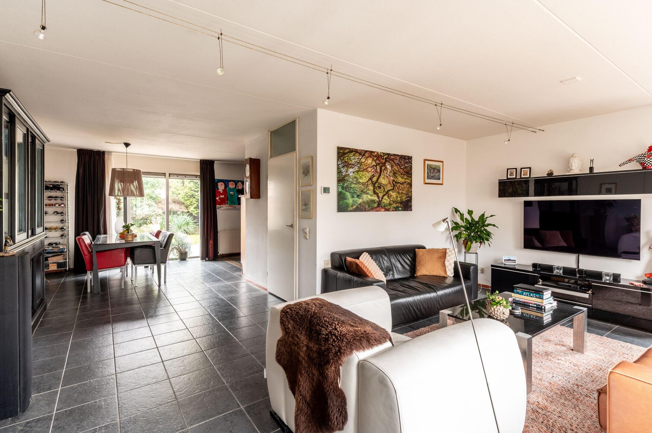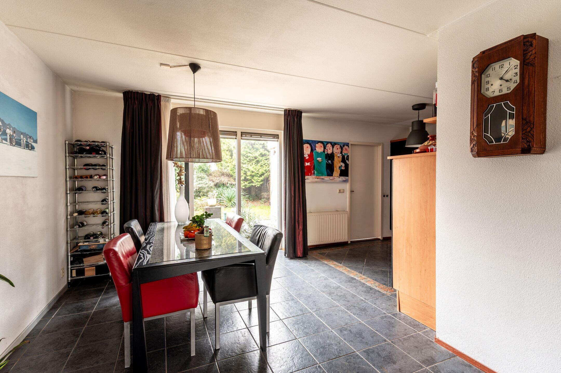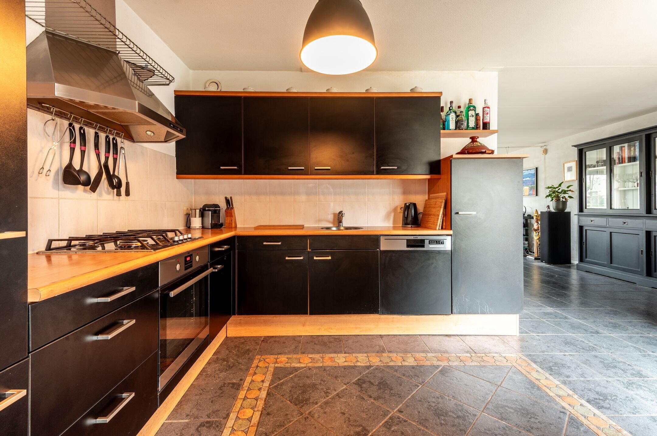 De begane grond is grotendeels voorzien van een in donkere kleurstelling uitgevoerde plavuizen vloer.