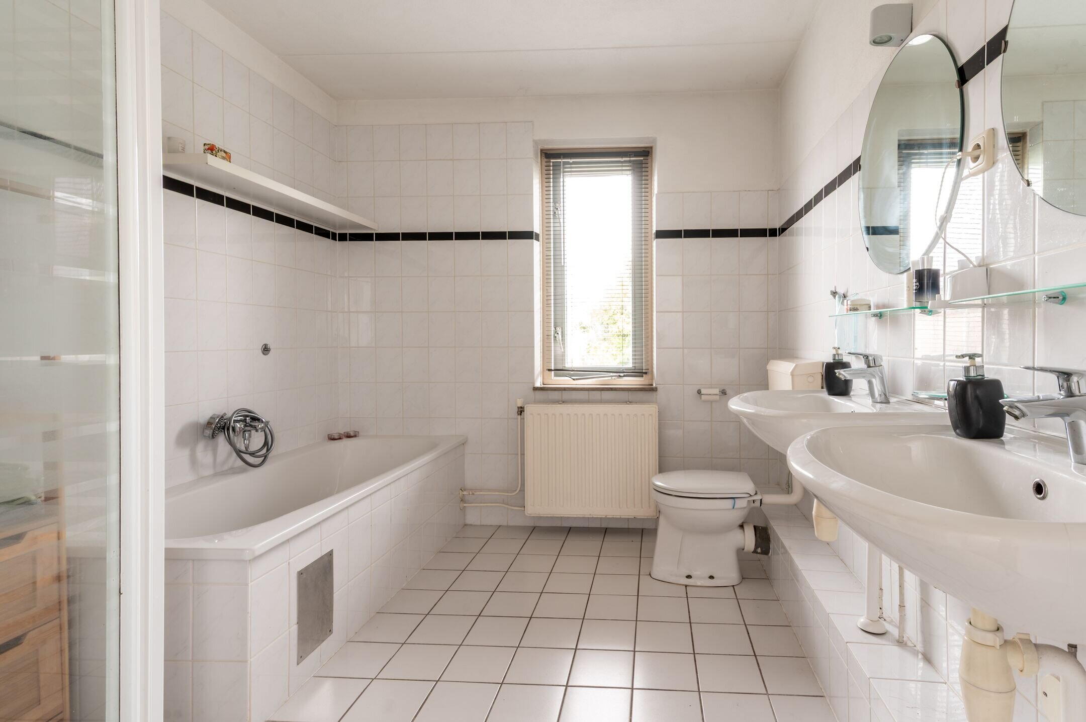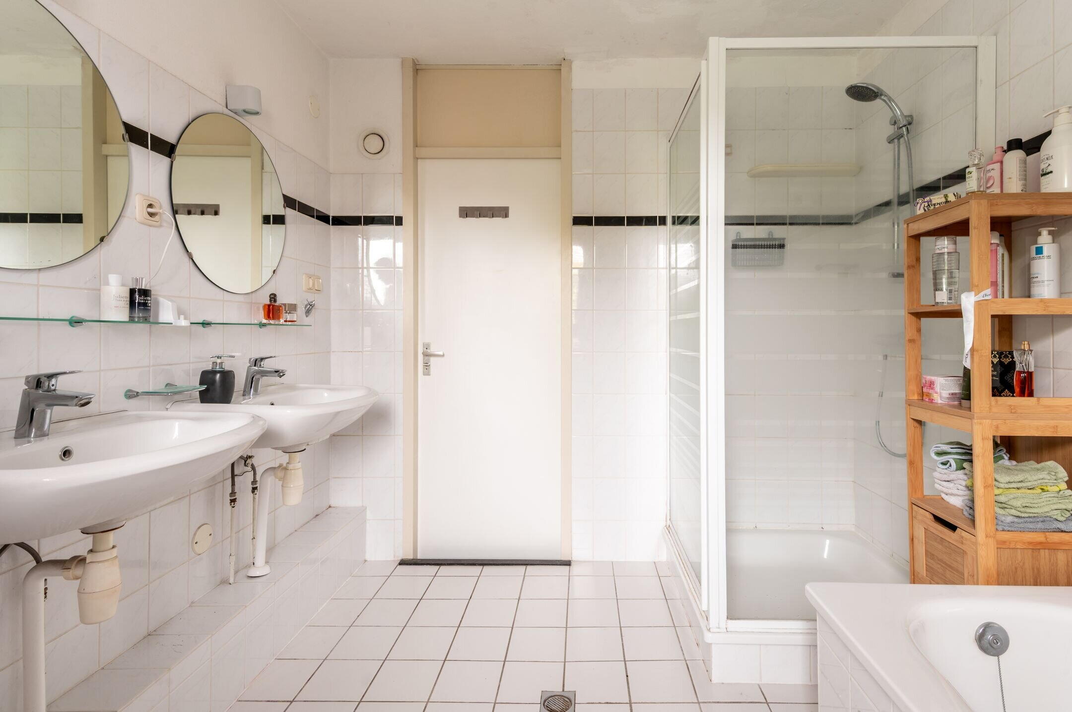 - Douche, dubbele wastafel, ligbad, en toilet
