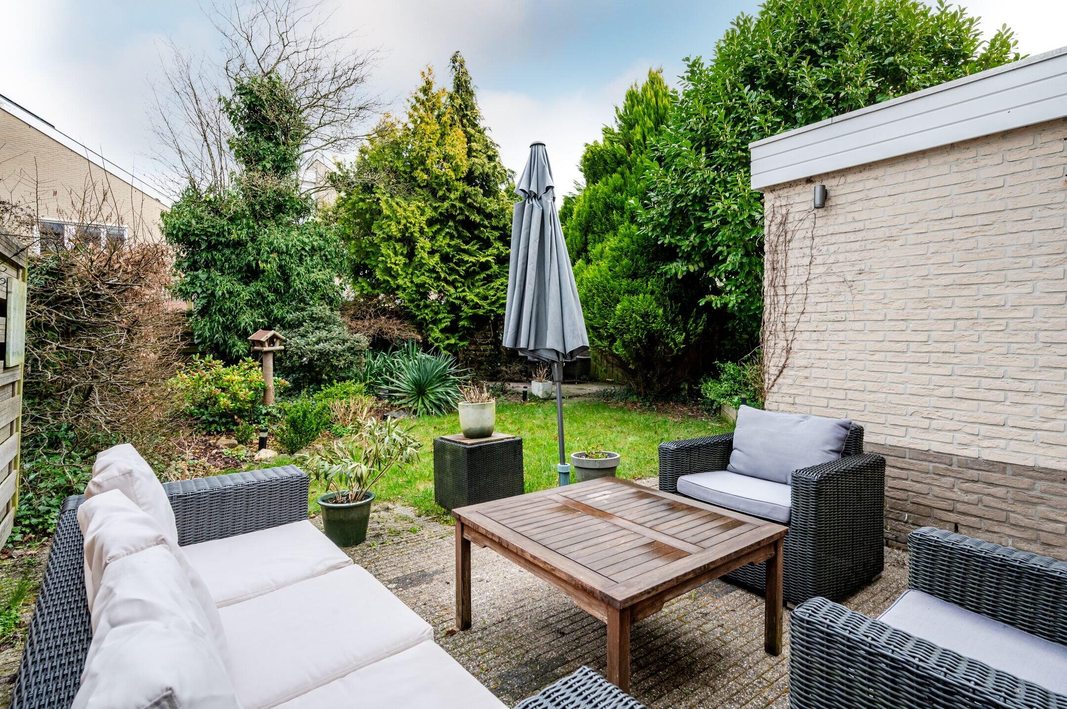 Tuin: De achtertuin is oosten gesitueerd; afmeting circa 10,50 x 10 meter, welke is voorzien van een terras bij de woning, een gazon, houten/beukenhaag erfafscheiding en diverse (volwassen) beplanting. Ook de voortuin is voorzien van diverse fraaie beplanting én voldoende parkeergelegenheid op eigen terrein.